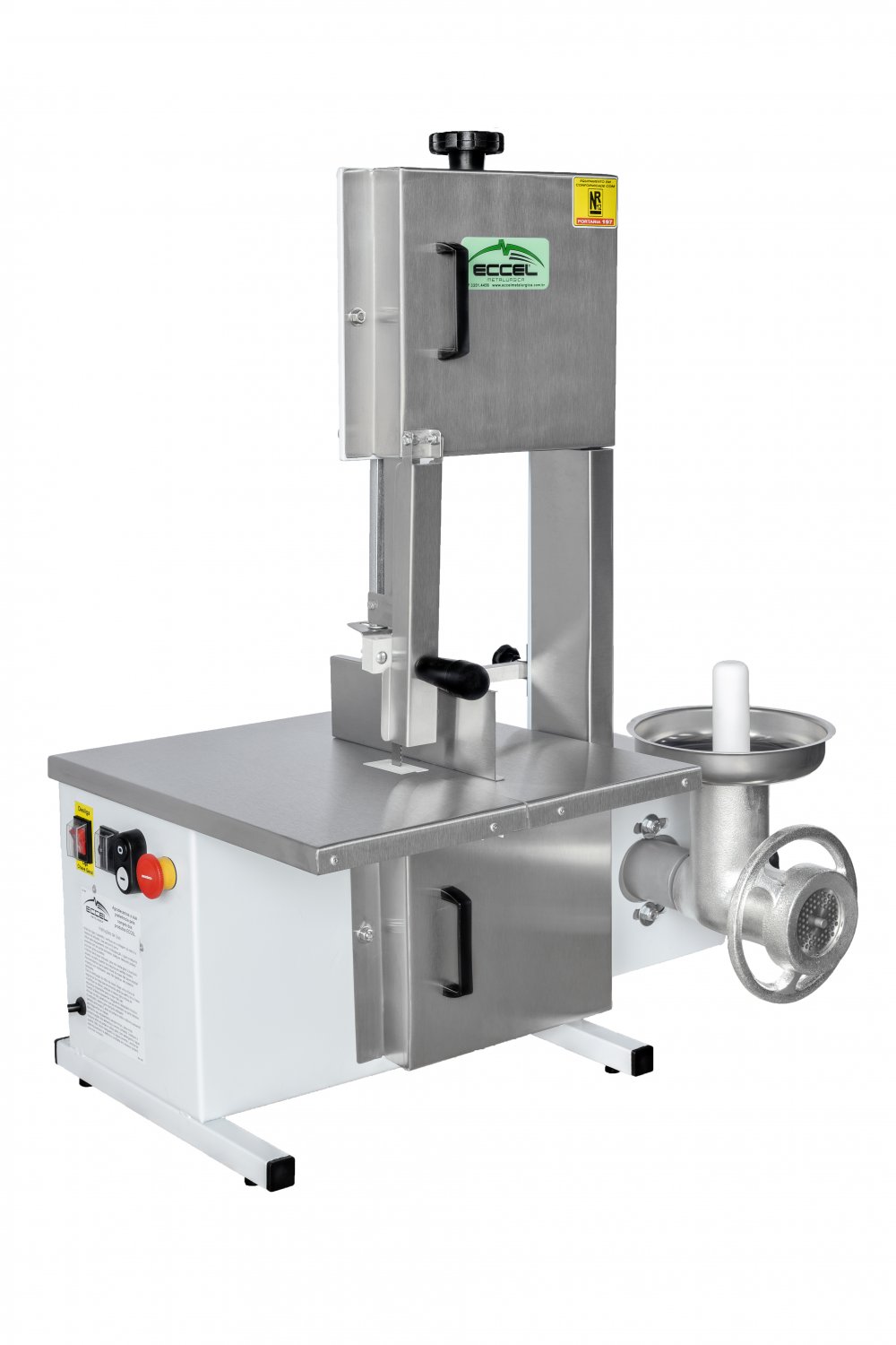 A Mini Serra Fita 180 COM MOEDOR Semi-Inox é um equipamento para uso profissional com estrutura em chapa de carbono com pintura eletrostática e portas inferior e superior em aço inox 430.